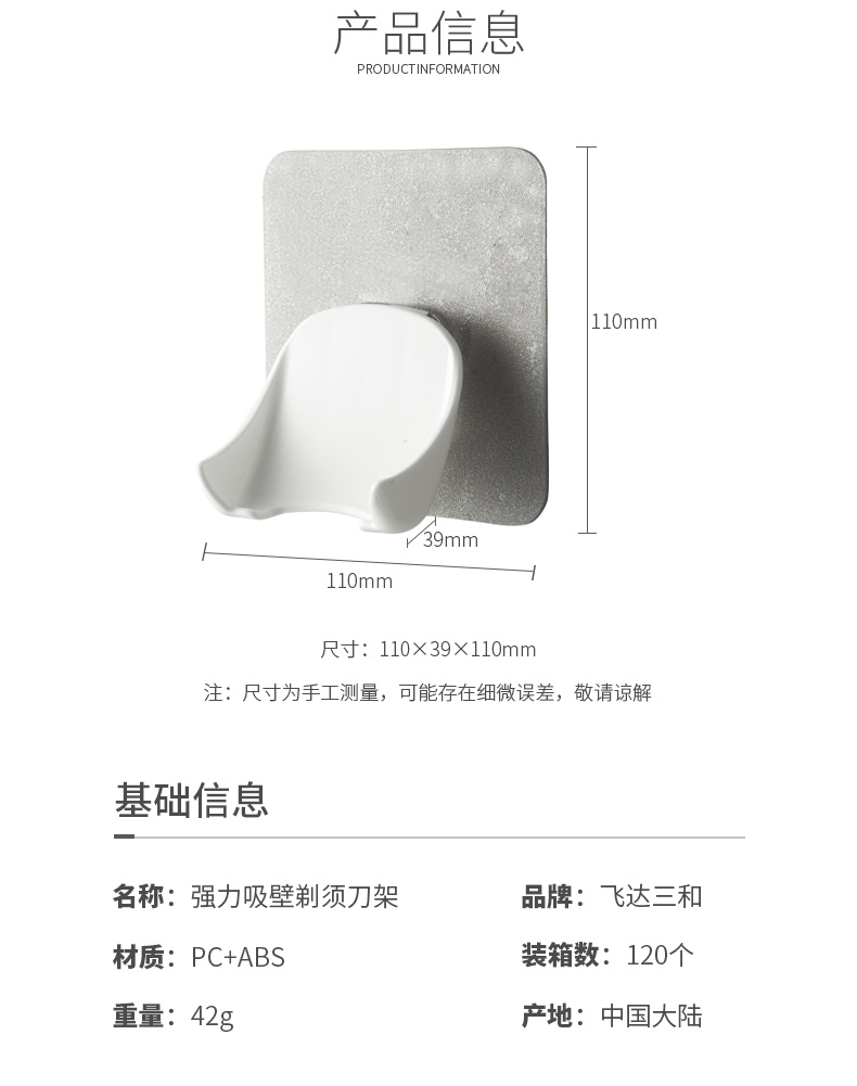 品牌(pái)名稱:www.17c.com 生(shēng)產地(dì)區:中國·浙江·台州 產品貨號:R5410 裝箱數:120 產品尺寸:11*3.9*11cm 外箱尺寸:37*29*48cm 條形碼:6931643818339 www.17c.comR5410 強力吸壁剃須刀架