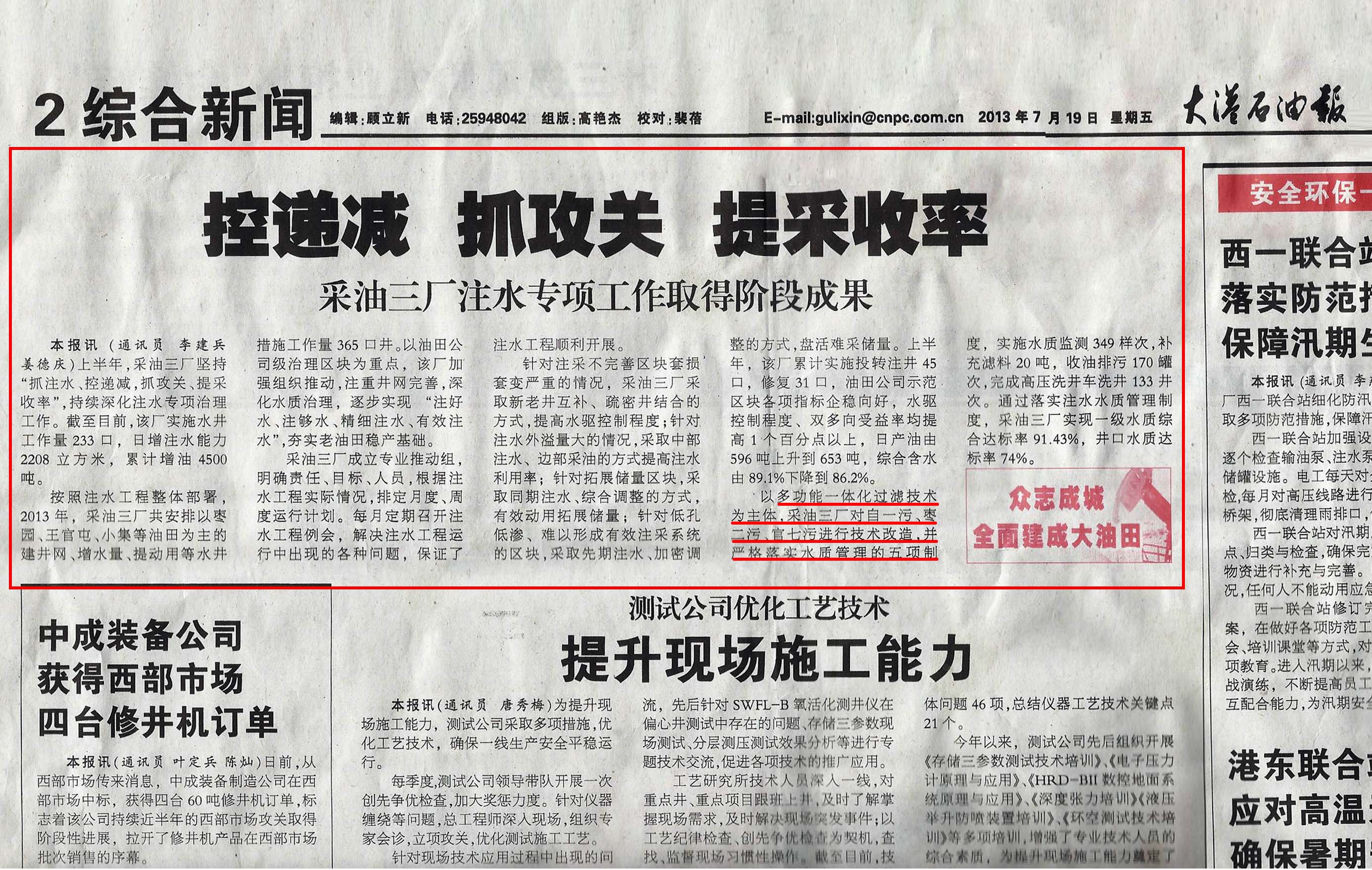 2013年6月公司產品被《大港石油(yóu)報》多次報道